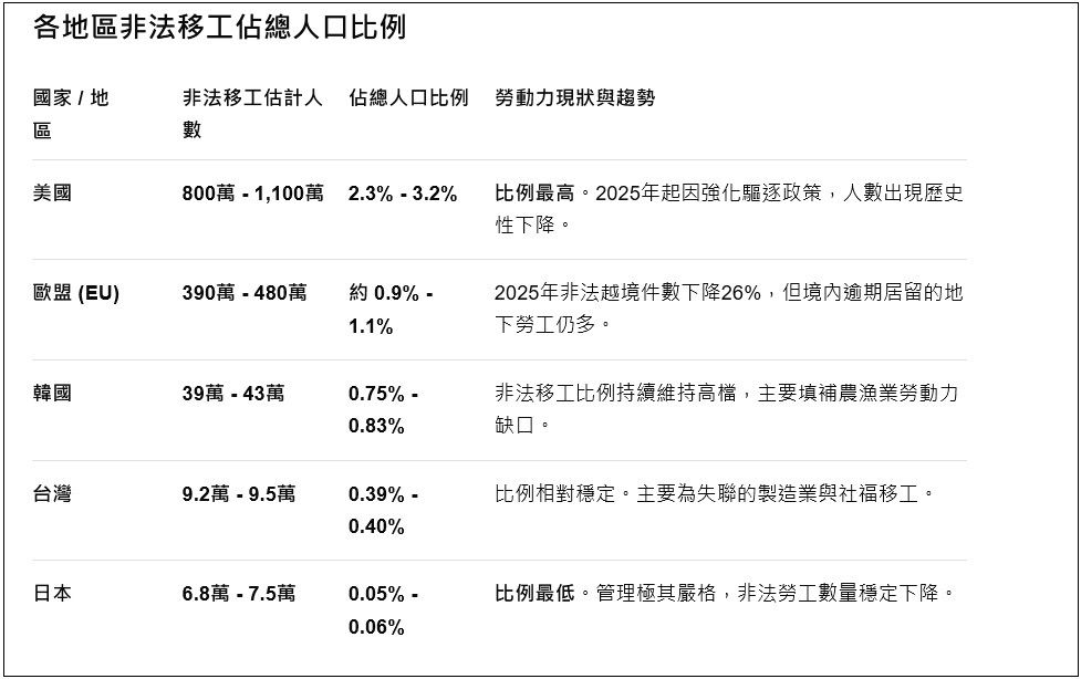 歐盟大約有 390 萬到 480 萬人,比例約 0.9% 到 1.1%。雖然 2025 年非法越境的案子