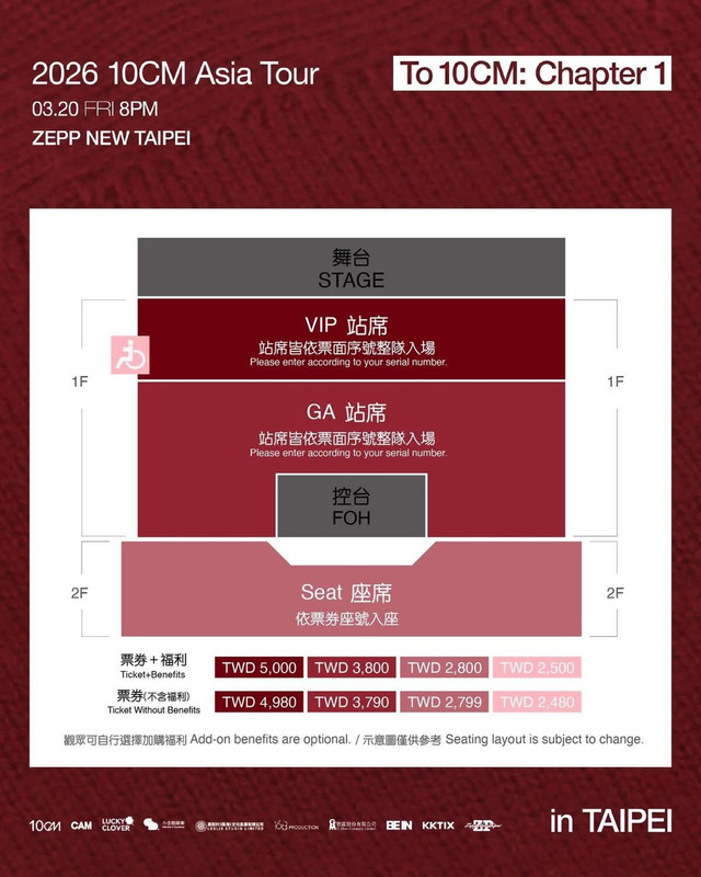 1F站席:VIP TWD 5,000 / GA TWD 3,800 / 愛心票 TWD 2,500