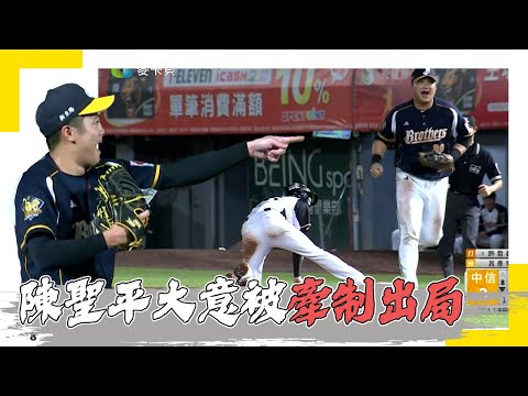 8局下,陳重廷敲安,陳聖平四壞攻佔一、二壘,中信一壘手陳俊秀在2出局設下陷阱,先