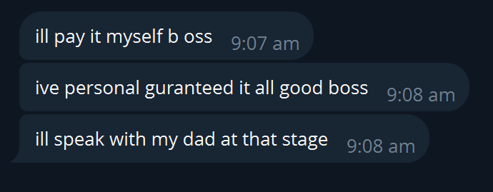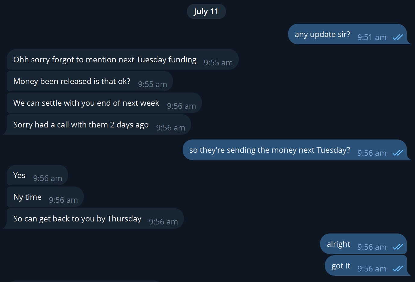 Sean:已電匯了,老闆,但他動作很晚。今天下午會確認我們是否有收到,或最晚下週初!