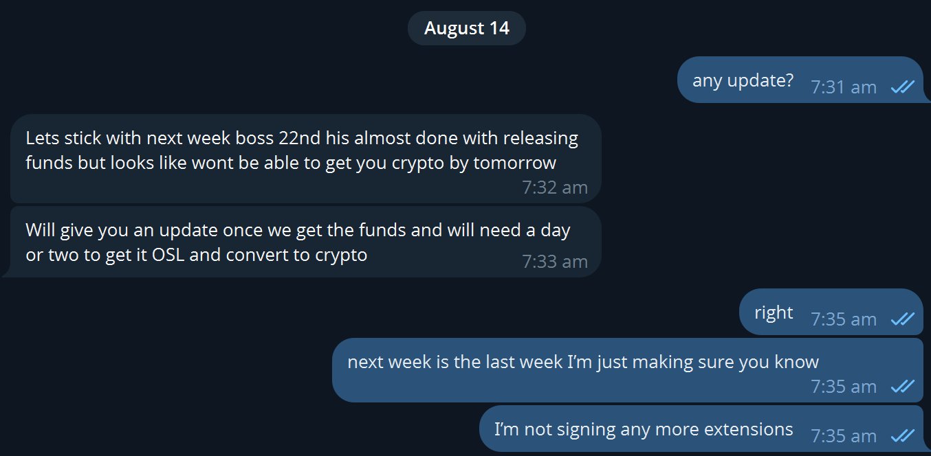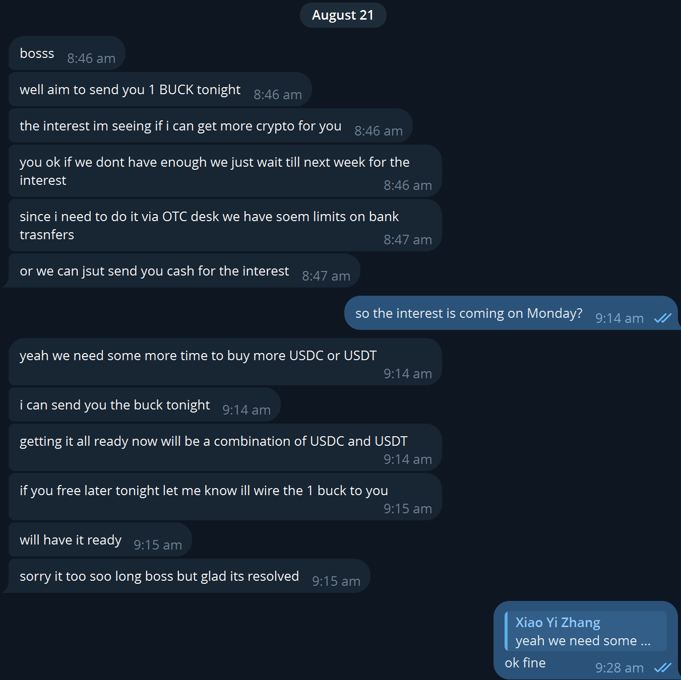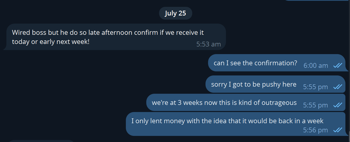 又過了一週後,我們把貸款重新簽了再延 3 週,年利率 20%(時間:7 月 17 日)