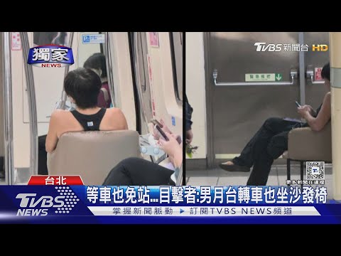 有男子搭北捷自帶沙發椅,不只在車廂內,就連在月台等車,也不用站著,坐在沙發上,