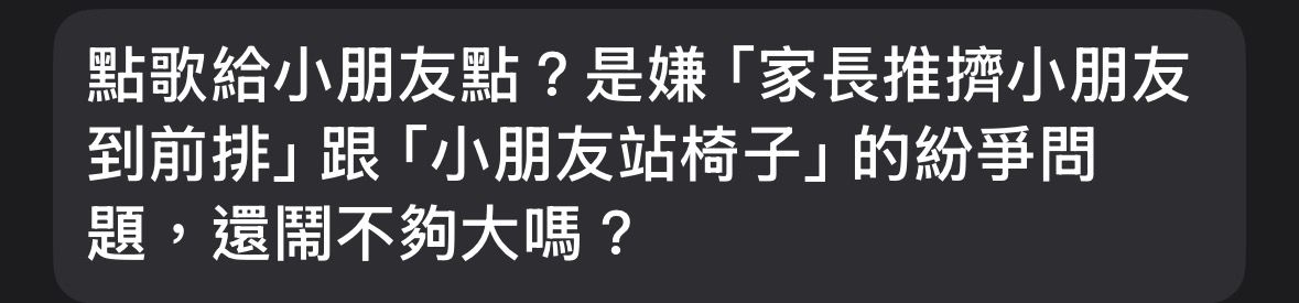 推 bubblet: 1227點歌趴,A5那區有爸爸把兒童(不是小小孩)扛在肩膀上。都開歌了還繼續扛的..也沒有工作人員阻止..135F 01/02 16:17