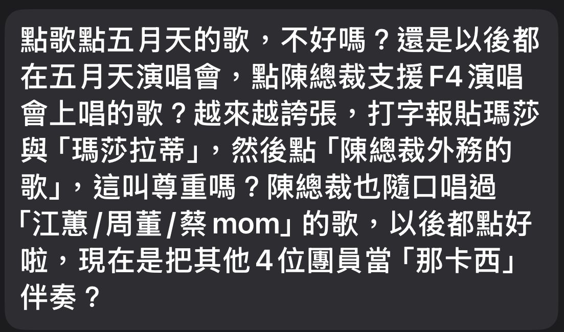 推 adgjk: 其實連主唱自己的單曲都應該避免,因為不是每首都由五月天製作,除非像青空未來團員有練過、有在演唱會正式歌單出現過,否則不是也為難四月天嗎