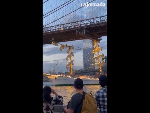 1艘墨西哥海軍訓練高桅帆船Cuauhtémoc號18日晚間離開紐約時撞上布魯克林大橋底部,