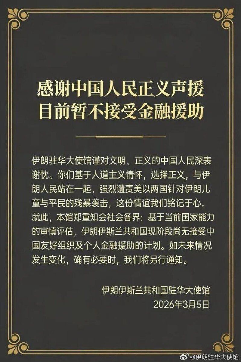 觀察者網報導,伊朗駐華大使館5日在其微信公眾號官方帳號上發文說,感謝中國人民正