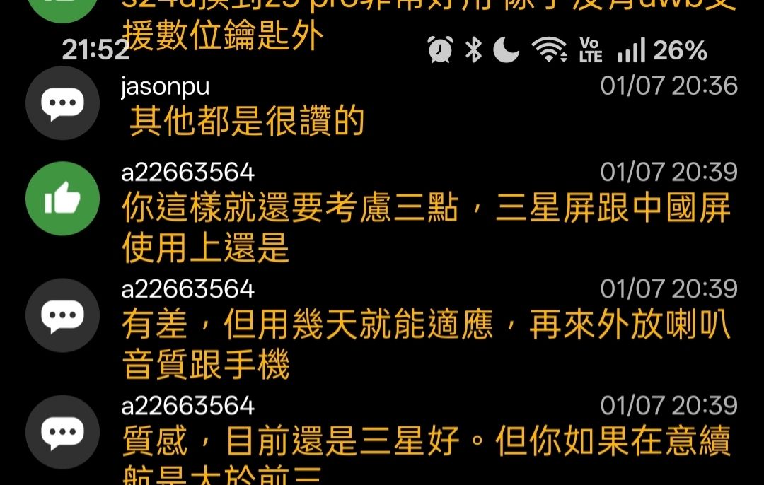 推 a22663564: 你這樣就還要考慮三點,三星屏跟中國屏使用上還是有差,但用幾天就能適應,再來外放喇叭音質跟手機質感,目前還是三星好。但你如果在意續航是大於前三者是可以用Oppo,至於相機色彩Oppo會比S25U討喜一些,夜拍對於各家旗艦機來說已經差不了太多3F 01/07 20:39