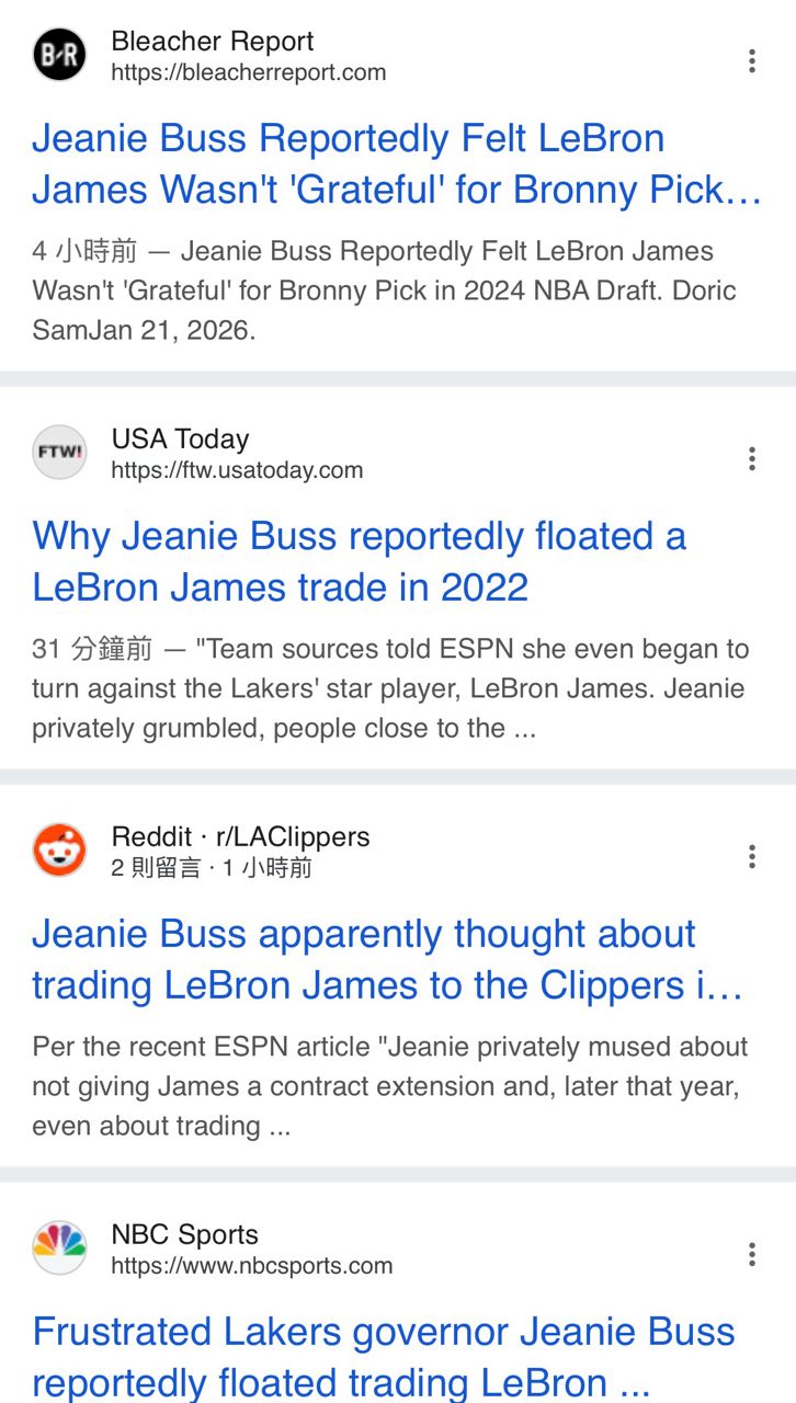 看板 NBA作者 cody210488 ()標題 Re: [情報] Jeanie Buss不滿LBJ 曾考慮交易他時間 Thu Jan 22 03:30:18 2026
