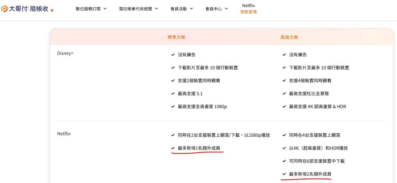 請問在台哥大辦的Netflix方案(包括單辦 雙享 三享)
