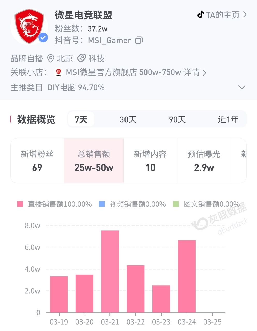這張截圖的微星官方抖音旗艦店後台數據,七天只賣快200萬台幣,成本都還沒算進去,