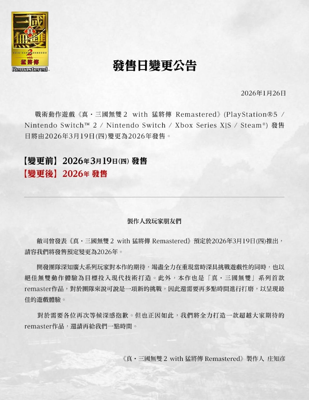 作者 basala5417 (basala)標題 [情報] 真三國無雙2》發售日改為今年未定日期時間 Mon Jan 26 18:07:32 2026