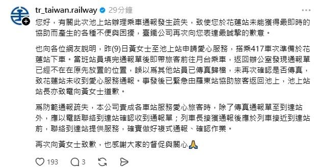 針對池上站通報疏失,導致黃女士於花蓮站未獲即時協助,臺鐵公司深表歉意,當班站員