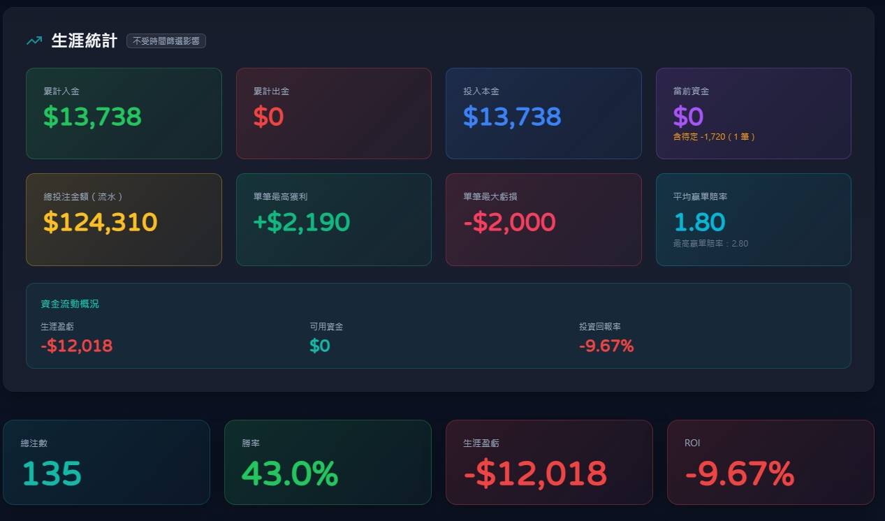 - 完整投注歷史,支援日期、球種、結果多條件篩選