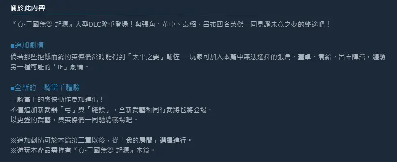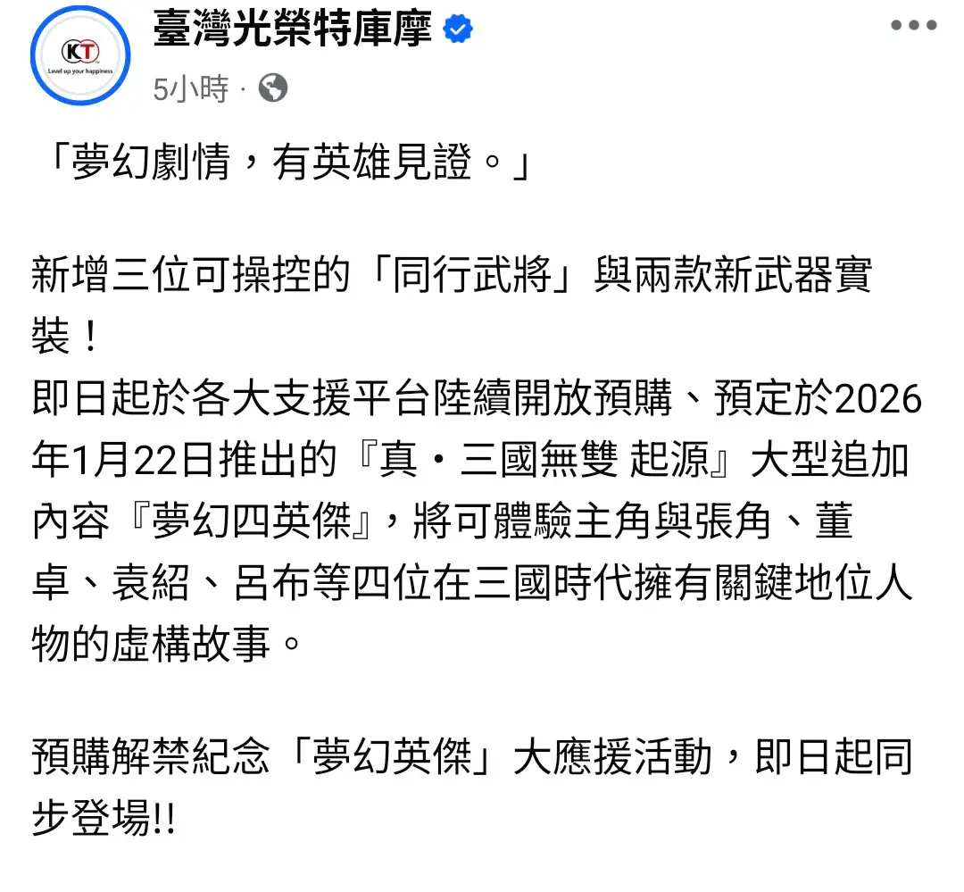 作者 ChHChen (硫酸無毒)標題 [情報] 真三國無雙 起源 DLC 夢幻的四英傑時間 Wed Nov 12 06:26:52 2025