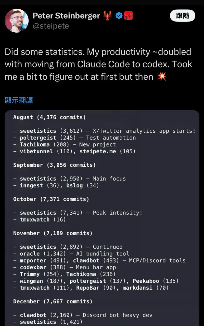 Openclaw作者一開始也是只用claude 後來交叉使用才自己比較出優劣55F 02/06 23:22