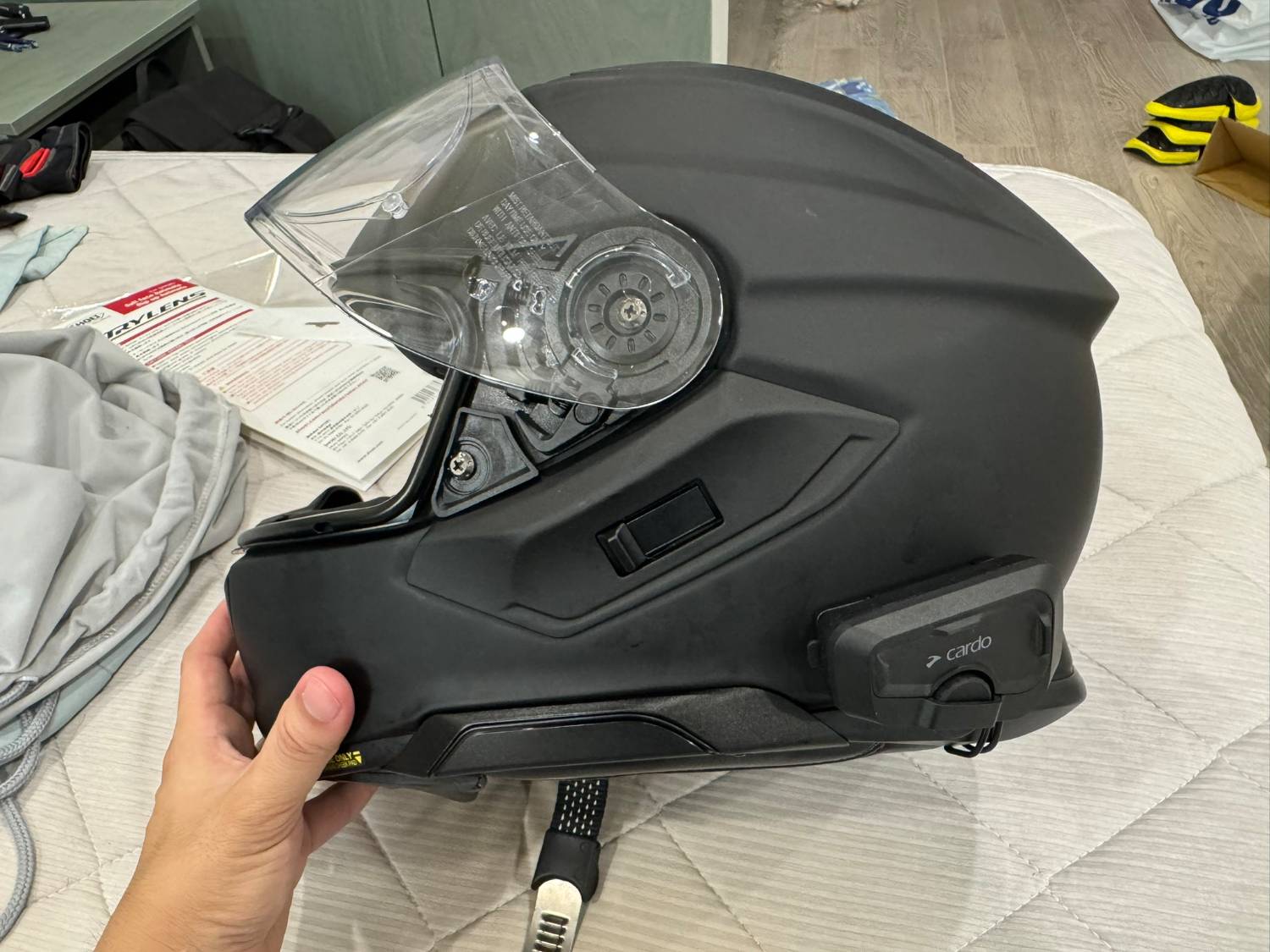 回到家後,馬上把藍芽耳機從舊的安全帽上換過來