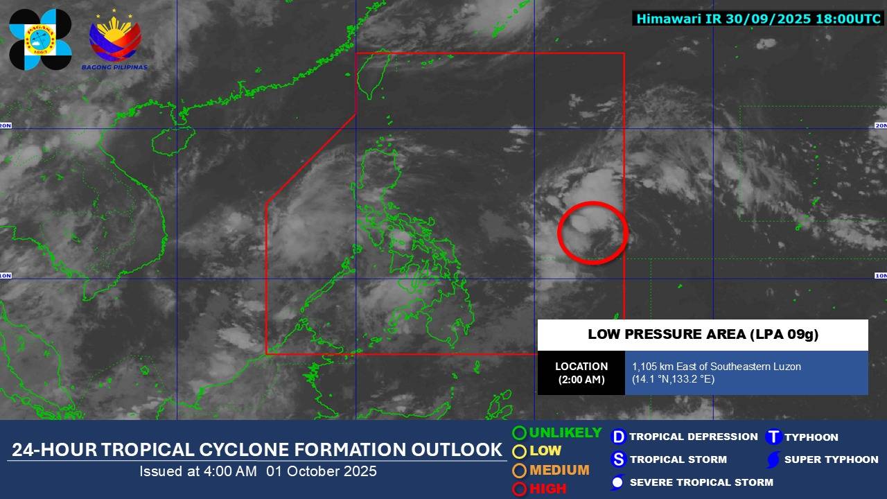 As of 2:00 AM today, 01 October 2025, Low Pressure Area (LPA 09g) is being