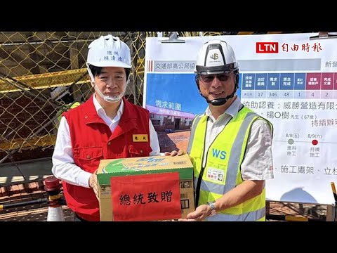 總統賴清德(左)致贈飲料給施工修繕團隊。(記者楊金城攝)