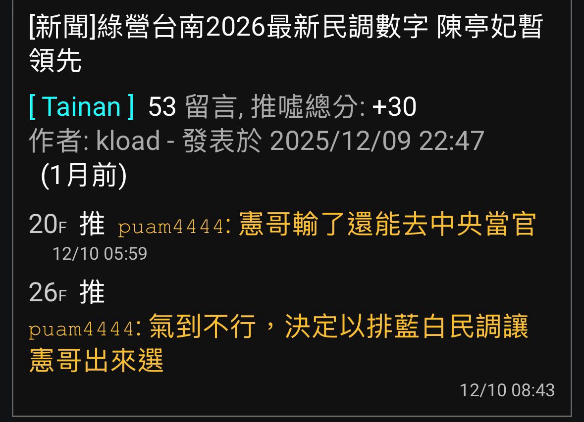 作者 kload (kload)標題 [新聞]幕後/憲妃大戰未了?綠喊台南「藍白介選時間 Thu Jan 22 19:28:24 2026