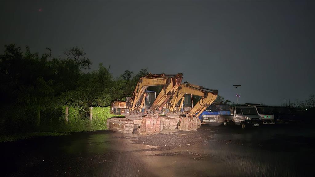 檢警凌晨拂曉出擊,查獲非法傾倒集團的挖土機等犯罪工具。(台南地檢署提供/郭良傑
