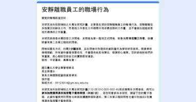 大家好,想問問看大家對於職場員工安靜的行為有什麼想法呢? 下面連結為我的大專生研究計畫問卷 主要是探討安靜離職員工的行為 目標對象為現在的在職或兼職工作者 希望大家可以幫忙填寫一下 只要填寫完成就可 …