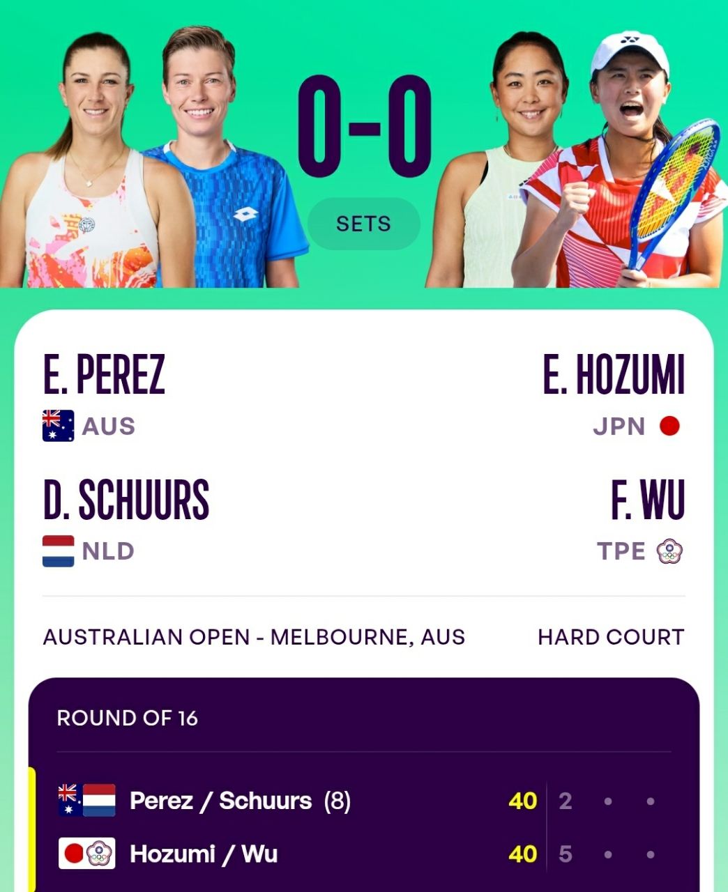 Perez, Ellen(澳洲)/Schuurs, Demi(荷蘭)vs.穗積繪莉(日本)/吳芳嫺(台北)