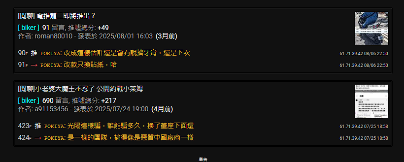 : 一年前開始只要在機車版發文 清一色在留言廣告三陽車款