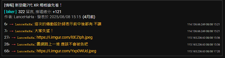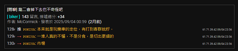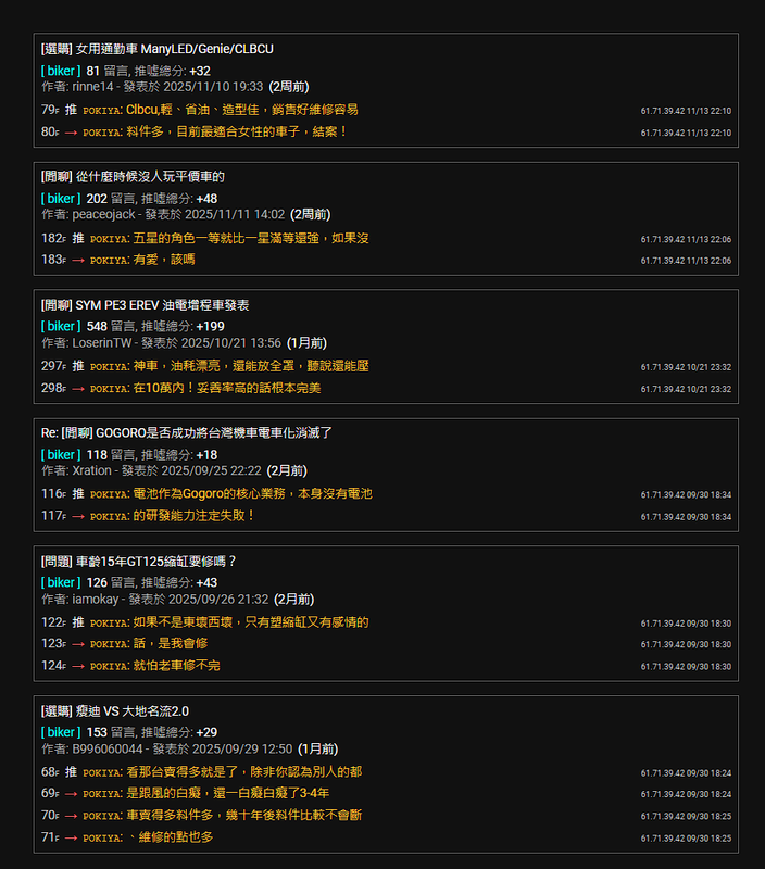 我之前不想禁的原因是 目前台灣機車(普重)市場就大概那幾家能選 對於禁推 我更擔心的是Biker的看板使用者會不方便 所以這幾年以來我沒有打算禁是因為這樣 但對敵人仁慈就是對自己殘忍 這幾年還是有無 …