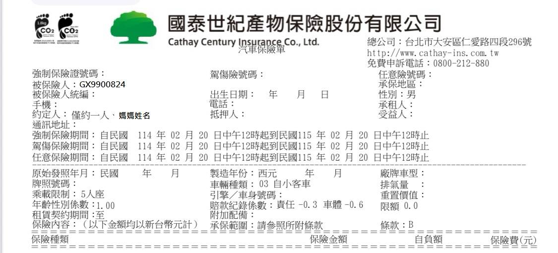 車子只有我在用 之前在南山投保限定有寫上我的名字 這次改國泰我還特地問保險員:怎麼
