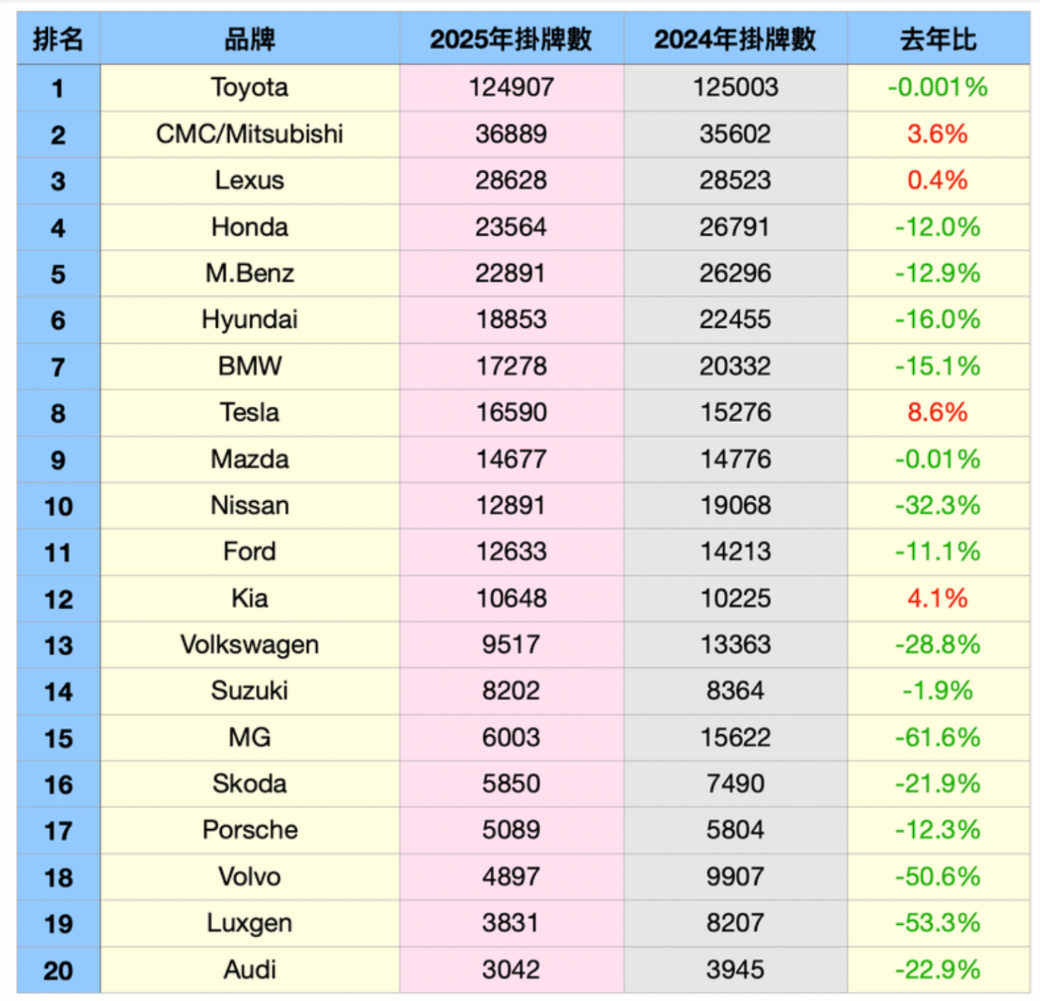 [情報] 2025台灣汽車品牌銷售前20強