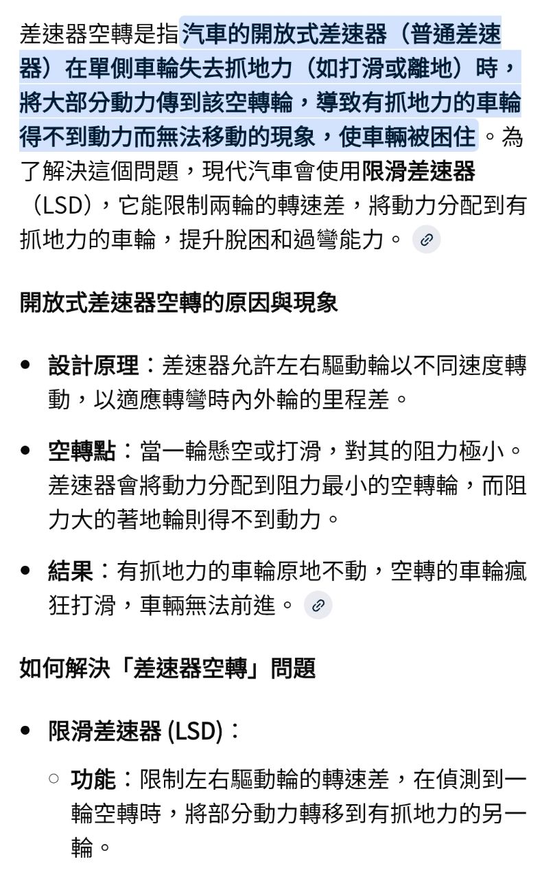 : 回一樓,無限滑差速器的後驅車前輪掉下去反而會因為對