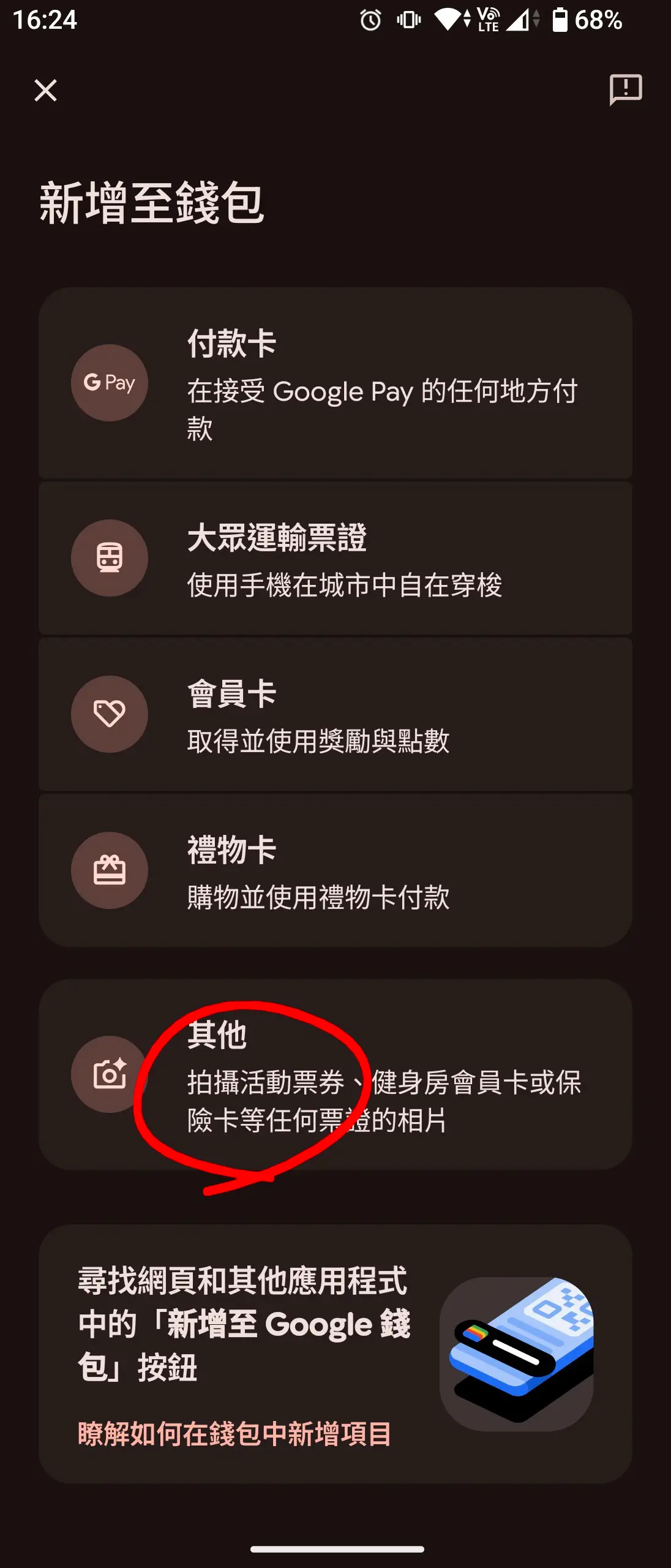 打開 Google 錢包,按右下角新增圖案,選其他