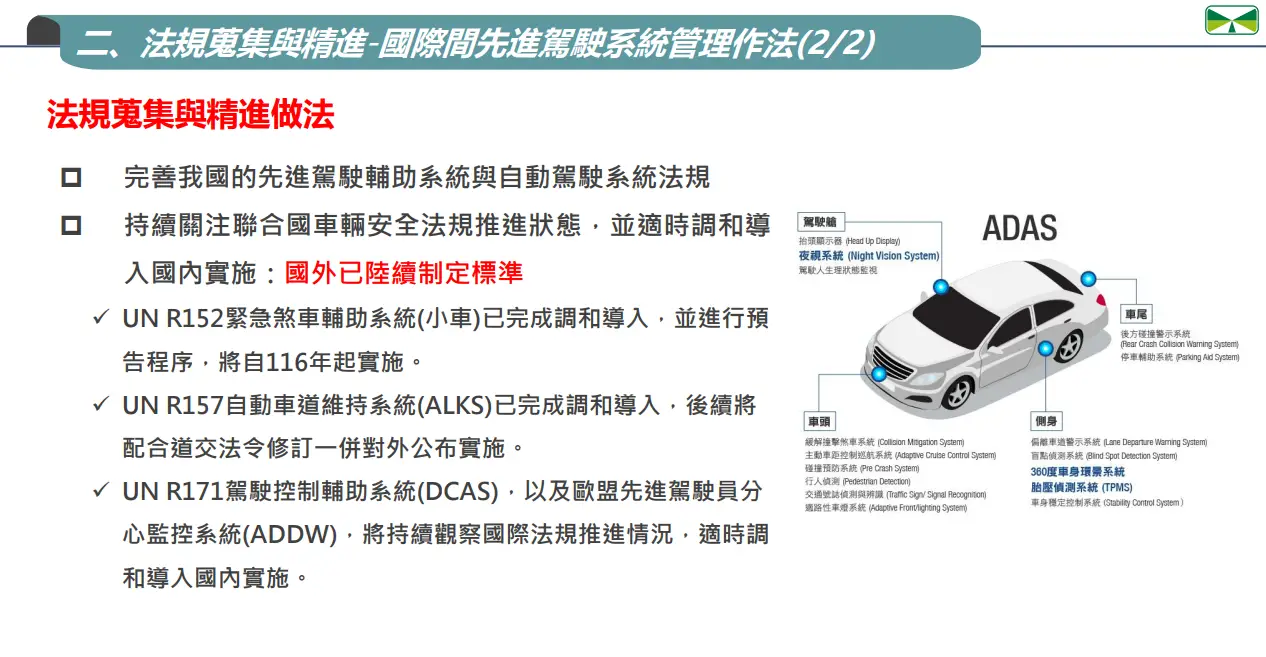 ・UN R157 自動車道維持系統(ALKS)已完成調和導入,後續將