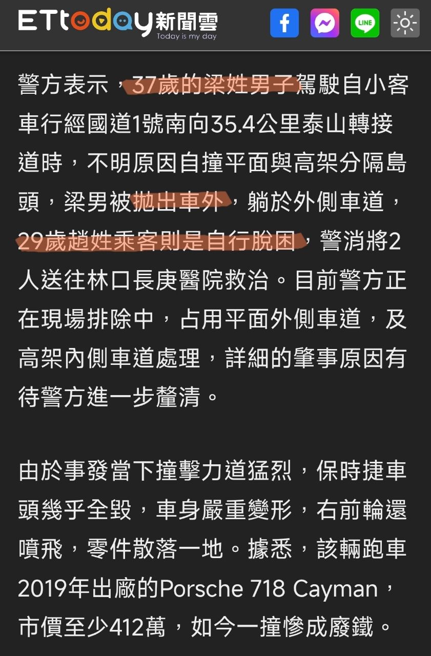 作者 hljjun (肥雞)標題 Re: [新聞] 保時捷國道自撞!37歲男噴車外斷腿見骨 時間 Thu Feb 19 20:31:55 2026