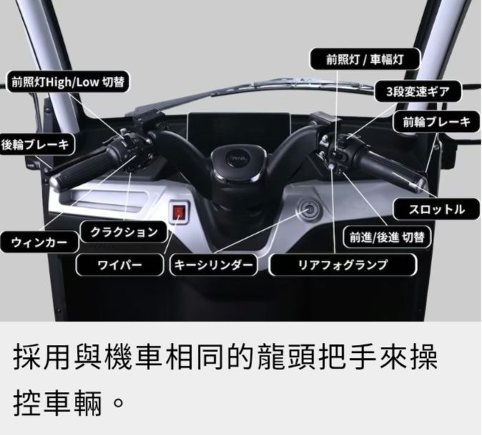 並採用與機車相同的龍頭把手來操控車輛,並可透過 USB 播放音樂,車內也配有安全帶
