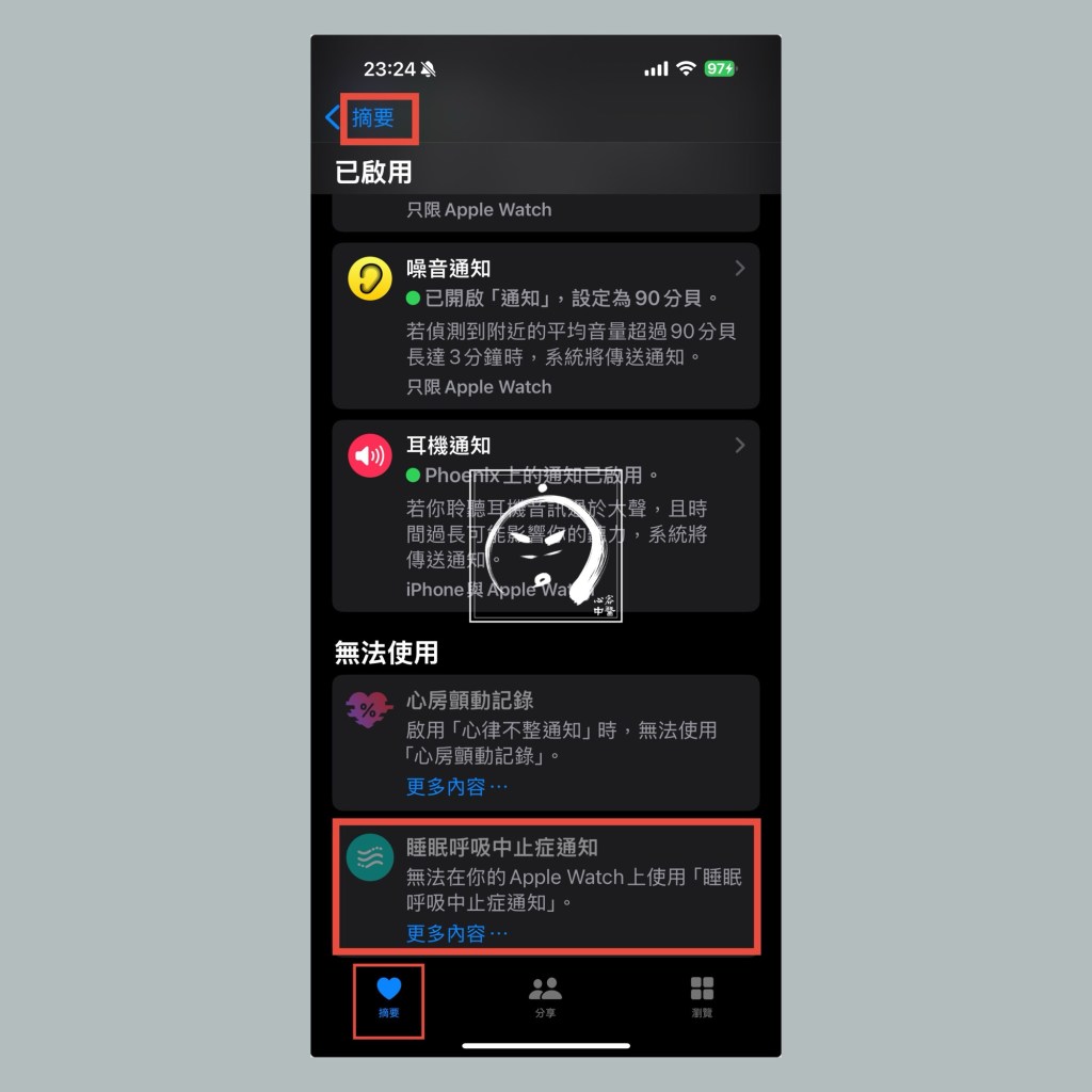 我記得我手錶第一次配對後我有看到睡眠呼吸中止 我點下去說無法用之類的