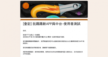 我是 PTT 站長之一的提莫, 誠徵100位測試人員 目前 新APP 與 中介服務應用層(中台) 需要一些使用者進行測試, 若您願意貢獻時間動動手, 我們將會安排您可以連線至新的測試站台以及獲得安裝官 …