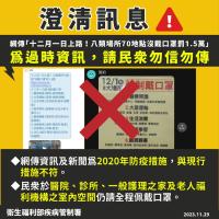 黴漿菌爆發!網傳八大場所12/1起強制戴口罩 疾管署曝真相 【記者林芳如/台北報導】近日社群軟體和網路謠傳「十二月一日起 8大場所強制戴口罩 」之錯誤資訊,疾病管制署今(11/29)日嚴正澄清,該內 …