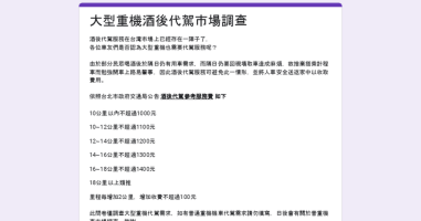 標題 因為小弟本身在代駕公司上班, 常常騎車去找朋友或是下班後吃飯變成喝酒行程, 每次都喝不了 麻煩各位帥哥美女們覺得有必要的話 幫我填一下問卷謝謝大家 市場有需求有數據我才可以提案給公司參考 有其 …