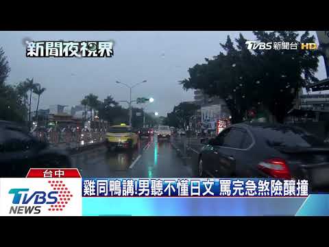 TVBS 台中一名日籍女駕駛,從停車場右轉直行在道路上,突然右側一輛轎車想切入車道,雙方差點撞上,男駕駛搖下車窗用台語飆罵三字經,日籍女駕駛當下很害怕,用日文回答她聽不懂,男子也聽不懂更氣了又大罵,最 …