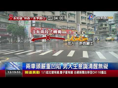 男大生趕約吃早餐 貪快左轉被撞飛50米 兩車頭嚴重凹陷 男大生意識清醒無礙 未2段式左轉釀禍 男大生恐挨罰賠車損 2018-1-7 台視綜合新聞 一時貪快,機車騎士轉彎釀禍!凌晨4點多,一名19歲的男 …