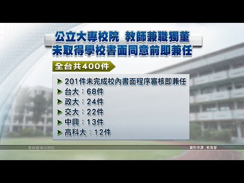 媒體來源:公視新聞網 教授兼任獨董爭議 教育部公布調查結果 台大校長人事案,因為涉及獨董爭議,曾引發各界討論。教育部配合立法院要求,公布國 立大專校院的教師兼職情況。全台有400件公立大專教授兼任獨立 …