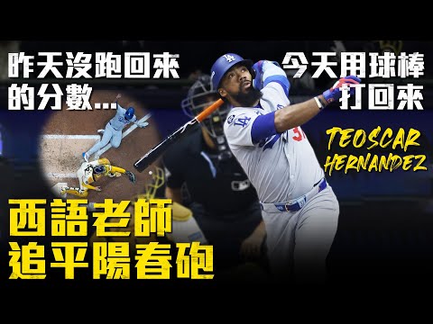 道奇對上釀酒人國聯冠軍系列賽第二戰, 二局上道奇0 : 1落後一出局無人在壘局面, Teoscar面對釀酒人王牌Peralta一棒炸裂, 用季後賽第四轟幫助道奇追平比分1 : 1 !!! 擊球初速1 …