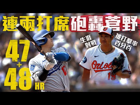 道奇對上金鶯系列賽最終戰三局上, 要避免被橫掃關鍵一戰作為首棒上場, 大谷從菅野手中雙響扛出本季第48轟, 幫助道奇取得2 : 0領先!!! 擊球初速108.2mph 飛行距離399ft 仰角27度 …