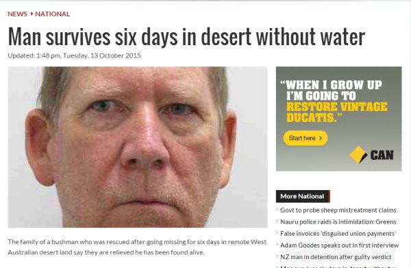 1.媒體來源: 東森 2.完整新聞標題: 澳洲男打獵迷路沙漠 靠吃黑螞蟻撐6天獲救 澳洲一名62歲的男子,日前到西澳一處沙漠狩獵,不料卻迷路了,由於在沙漠中嚴重缺水 ,為了要保命,他只能靠著在樹下吃黑 …