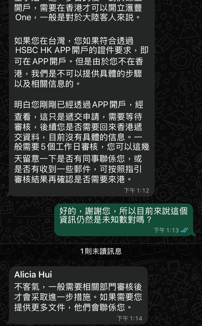 : 致電香港分行客服說台灣可以,但透過WhatsApp 問又說不行