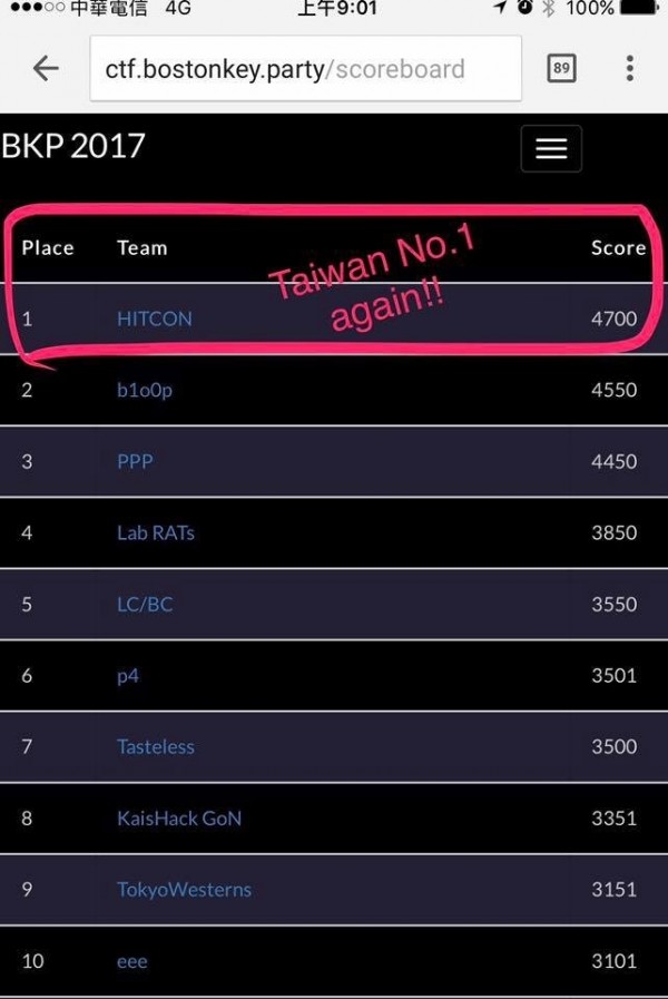 〔記者陳炳宏/台北報導〕台灣駭客戰隊(HITCON)連續第二年取得2017波士頓駭客賽( Boston Key Party,BKP)冠軍,同時也拿下今年世界駭客大賽(DEFCON CTF2017)門票 …