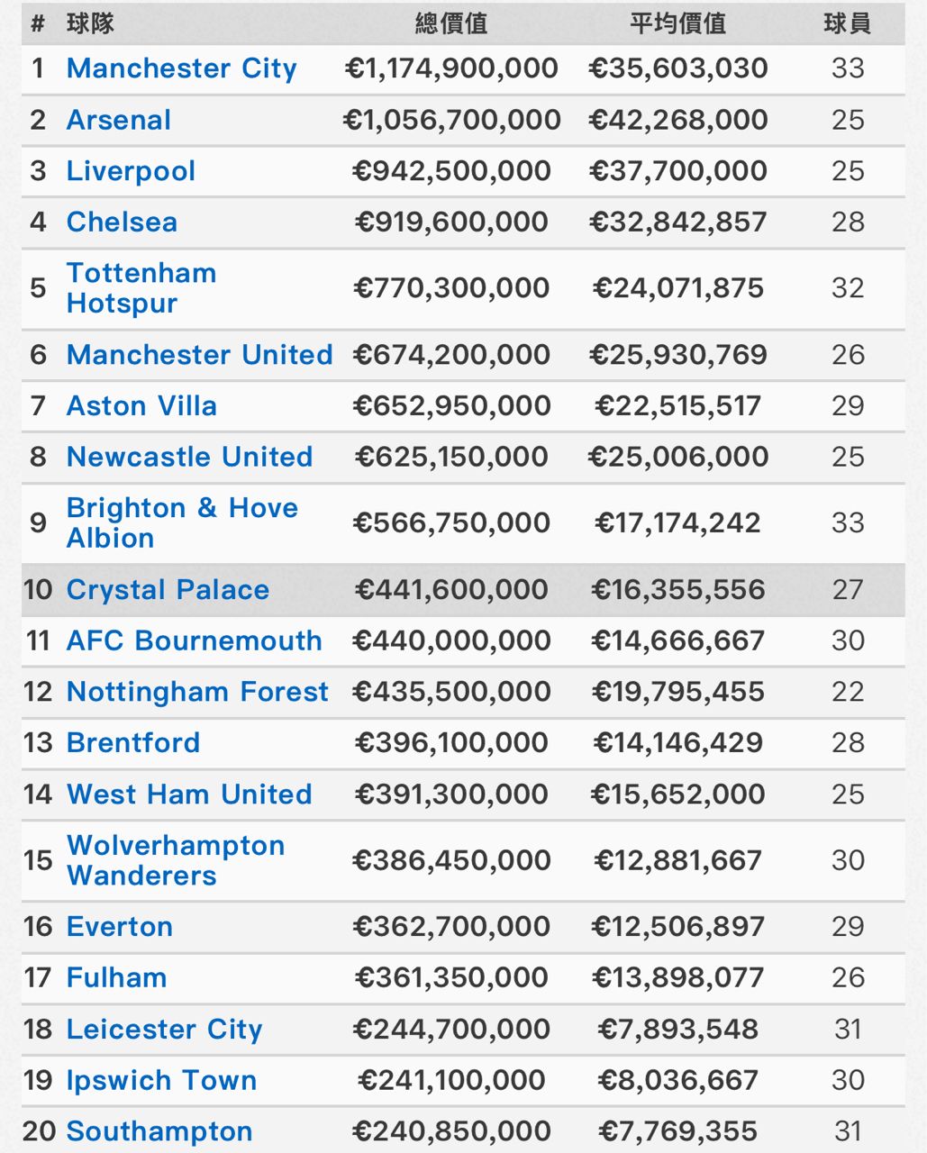 2026-01-10 15:15:34 推 serom: 英超球隊的市值都挺嚇人的 中職怎麼比… 20F 01-10 15:23