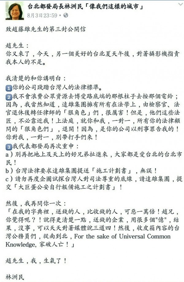 FB「藏頭詩」案 趙藤雄輸了 2017-01-25 16:27 〔記者溫于德/台北報導〕台北市都發局長林洲民不滿遠雄巨蛋公司施工情況不佳,還對 市府員工提告,日前在臉書以英文開頭「F、U、C、K」字句 …