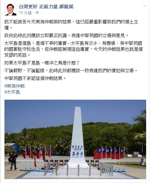 郝龍斌:如果太平島不是島 那沖之鳥是什麼? 自由 〔記者施曉光/台北報導〕針對南海仲裁案結果,國民黨副主席郝龍斌今晚在臉書聲明表 達無法接受,要求政府此時此刻應該立即嚴正抗議,表達中華民國的立場與意見 …